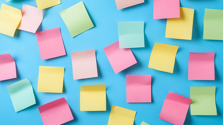 A vibrant display of colorful sticky notes on a soft blue background. Ideal for concepts of organization, creativity, and brainstorming in workplaces or educational settings.