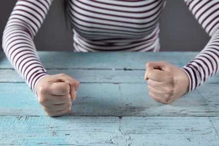 woman fists on the blue wooden table background
