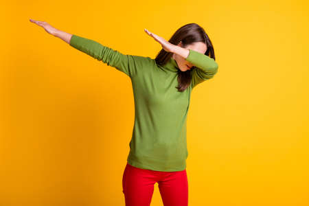 Portrait of attractive thin funky girl clubber dancing showing dab move clubbing nightclub isolated bright yellow color background