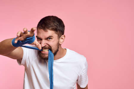 Sporty man in a white T-shirt boxing bandages on the hands of a workout lifestyle pink background