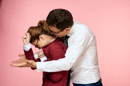 business man and woman office work colleagues team office management studio pink background