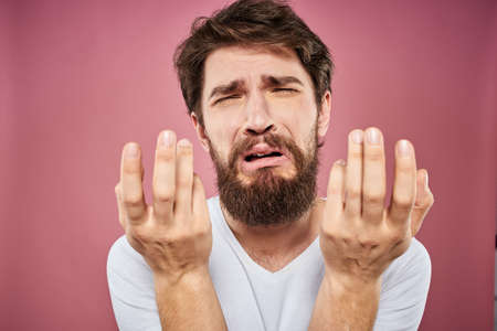 bearded man in white t-shirt emotions displeased facial expression studio pink background