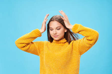woman in yellow sweater holds hands near head emotions blue background