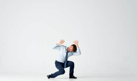 Frightened man. Emotion of fear. Scared screaming male, threaten concept