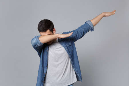 Handsome stylish unshaven young man in denim jeans shirt posing isolated on grey wall background studio portrait. People sincere emotions lifestyle concept. Mock up copy space. dab dance gesture hands