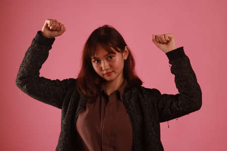 young sporty asian beautiful showing strong gesture on white background