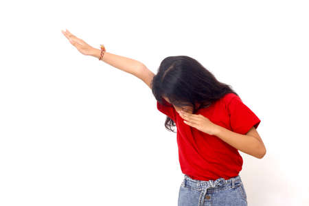 Asian little girl standing while making dab team hand gesture. Isolated on white background