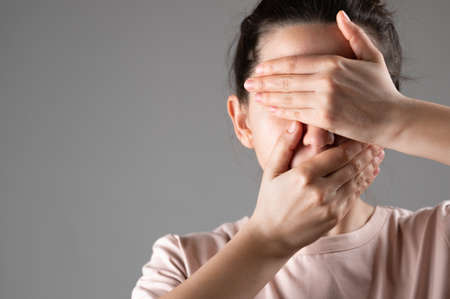 The woman covers her mouth and eyes with her hands.