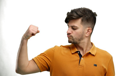 Man, close-up, on a white background, shows strength