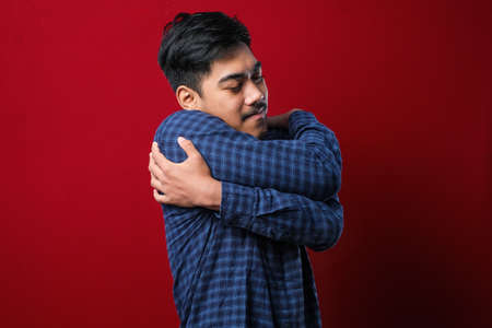 Young handsome man over isolated red background Hugging oneself happy and positive, smiling confident. Self love and self care