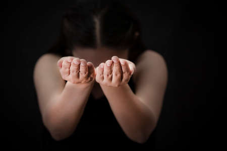 I stand before you with hands wide open. Closeup of an unrecognizable person reaching out with their open hands against a blue background.