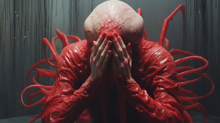 the creature, depicted in a stunning crimson red hue, stands in shock, hands clasped atop its head, conveying intense emotion in this hyper-realistic sci-fi artwork, reminiscent of alessio albi's style, crafted with bryce 3d and minimal retouching, featuring grainy, tenebrous tones and bold, dynamic lines, evoking andrew ferez's aesthetic. ai generated