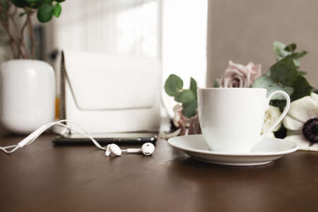 A cup of coffee with a bouquet of tender anemone, eucalyptus branches and pastel purple roses, a woman handbag, headphones and a phone on a brown wooden table. Blurred background