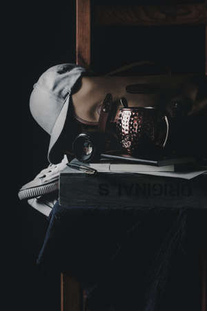 books next to coffee cup and old camera all on wooden table in tone know