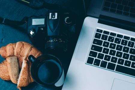 Typical photographer / blogger workplace in the morning. DSLR camera and laptop. Tasty croissants and cup of hot coffee