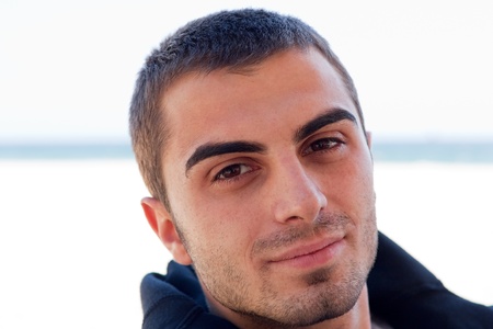 Portrait of calm handsome young ma enjoying summer holiday at the beach. at sunset.