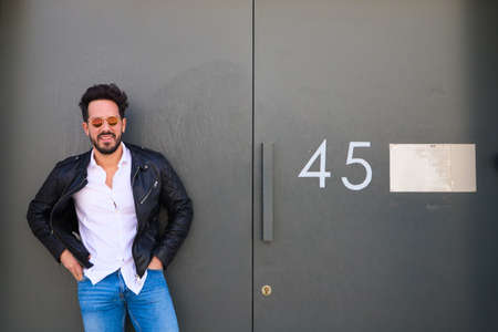 handsome young man with beard, sculpted body and sunglasses stands at the gray door of his garage while doing different poses for the portrait. Concept different expressions.