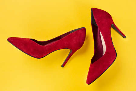 Women's shoes bright red suede on the wooden background.Women's shoes bright red suede on a wooden background.