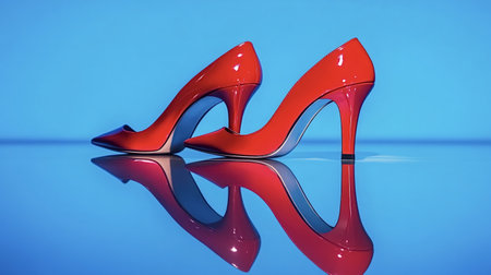 Shiny, vibrant red high heel shoes stand on a reflective blue surface, creating a striking contrast and a sense of modern elegance and style