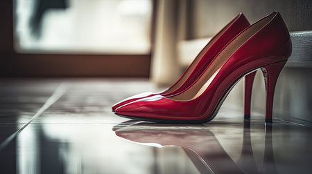 A stunning pair of red high heels sits gracefully on a polished surface, exhibiting elegance and style within a contemporary interior. The reflection enhances the visual appeal, making this image perfect for fashion-related themes.