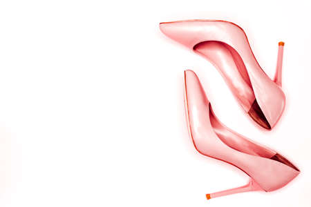 Beauty blog concept. pink nude female shoeson white background. Flat lay, top view trendy fashion feminine background.