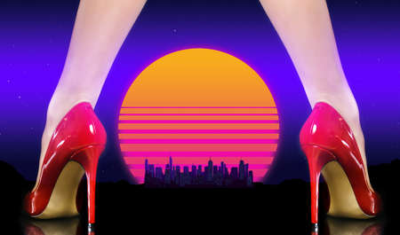 beautiful female legs in red stiletto heels on the background of the evening solitude and the city on the horizon