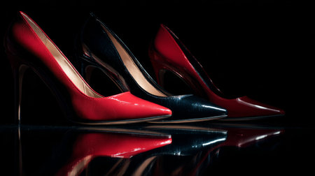 High heels in red, black, and burgundy stand on a glossy black surface. A dramatic spotlight shines on them, creating elegant reflections and a sense of luxury styling.