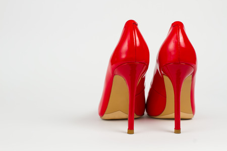 Pair of fashionable high heel leather red cut-out female shoes with golden buckles isolated on light copy space background. Style and fashion, modern footwear concept.
