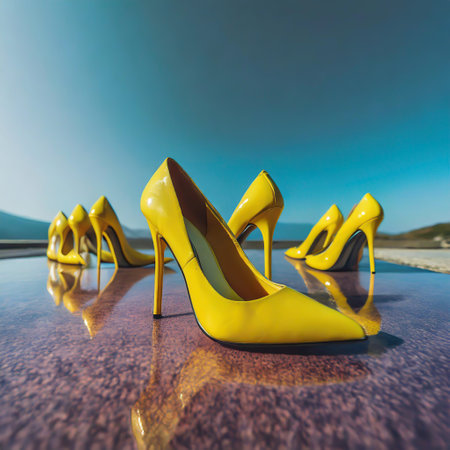 A striking bright yellow high heel shoe rests elegantly against a vibrant yellow wall, showcasing a perfect blend of modern style and minimalistic design.