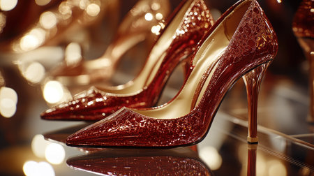 Stunning red high heels with a sparkling finish elegantly displayed in a retail setting. Perfect for fashion-forward individuals looking for style.