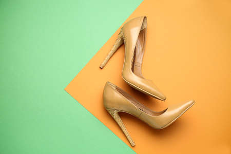 chic yellow patent leather stiletto shoes on a colored background fashionable