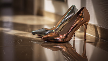 This stunning image features elegant high-heeled shoes in a luminous metallic finish, highlighting their sophisticated design on a soft surface. The warm lighting creates a captivating ambiance, making this footwear ideal for fashion presentations or retail displays.