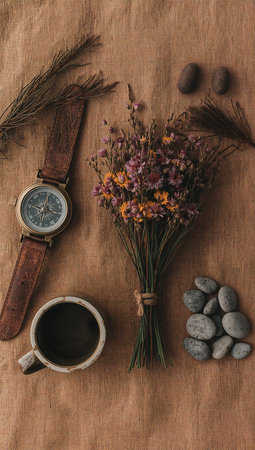 Wristwatch, cup of coffee and wildflowers on sackcloth