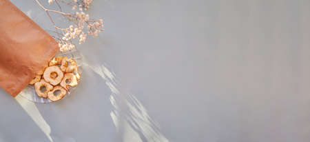 Paper bag with dried sliced apple chips - healthy snacks on the plate. Top view. Proper nutrition, healthy food concept. Gypsophila flower decoration. Extra wide banner. High quality photo