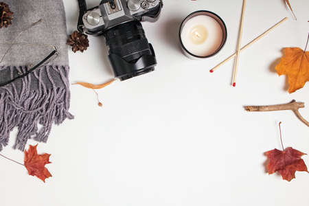 Scarf, camera, candle and yellow leaves, top view