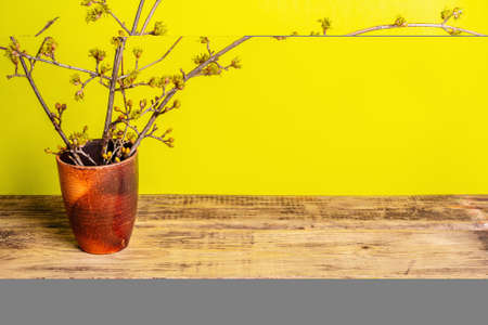 Blooming twigs of dogwood in a ceramic vase on a yellow sunny background. Spring, Easter, and good mood concept, place for text