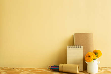 Notebook, colored pencils, flower on wooden desk. beige background. Work and study place