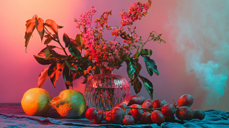 A vibrant still life featuring a bouquet of colorful flowers paired with fresh fruit, set against a soft pastel background.