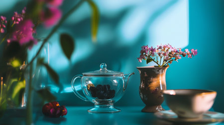 A vintage tea setup featuring delicate blue and gold accents, exuding charm and elegance in soft lighting.