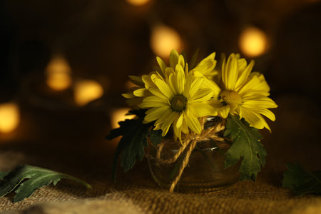 still life with bouquet of yellow flowers and lights