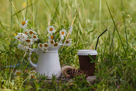 Coffee takeaway,chamomile flowers and books in park