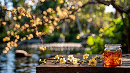 A glass jar filled with tea is placed on a wooden surface beside blooming branches and a pond. The composition is in soft focus with natural sunlight illuminating the scene. Ideal for illustrating concepts of tranquility and relaxation, the image could be used in various commercial and editorial contexts.