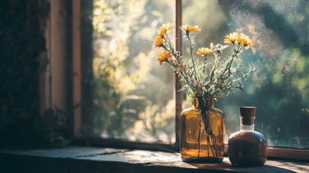 A rustic scene featuring yellow flowers in a glass vase by a sunlit window, evoking warmth, tranquility, and natural beauty in a cozy setting.