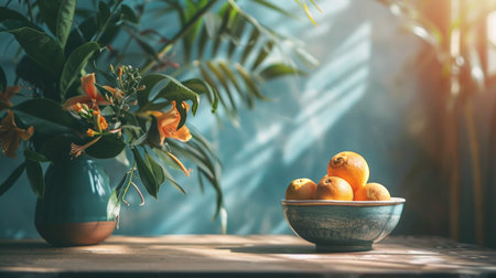 A bowl of fresh oranges on a table next to a floral arrangement, bathed in soft, warm sunlight for a serene ambiance.