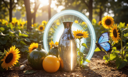 An orange liquid jar sits on a weathered wooden surface, surrounded by yellow flowers. The composition includes a blurred background featuring a lake and sunlight. The image exhibits a warm color palette, potentially suitable for beverage or natural product advertisements. It can be used for various commercial projects.