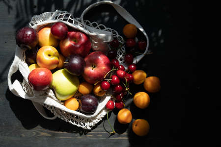 Fresh ripe fruits and berries on a black wooden background in an ecological mesh bag. Lifestyle. Hard shadows.Sunlight. Copy space.