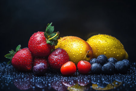 Fresh fruits showcase vibrant colors and droplets of water, highlighting strawberries, blueberries, cherries, and lemons on a sleek surface.