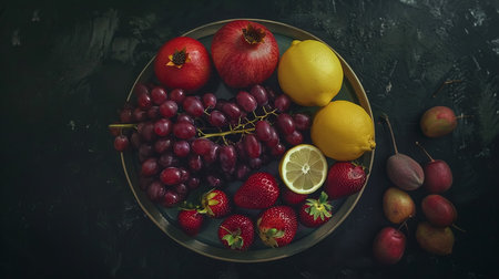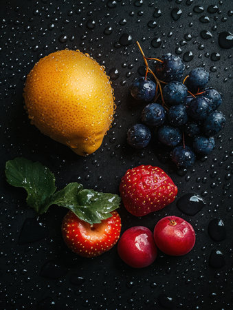 An assortment of fresh fruits including lemon, grapes, strawberries, and plums arranged on a dark surface adorned with water droplets.