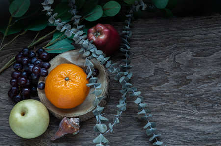 Variety of fresh assorted fruits on the old wooden table. Assorted fruits colorful background, healthy fruits, Dark tone, Selective focus.