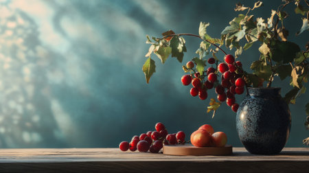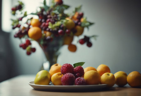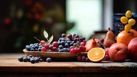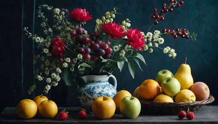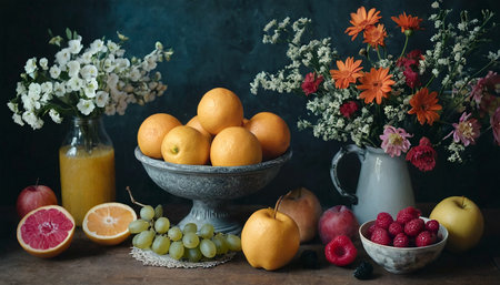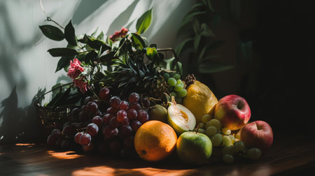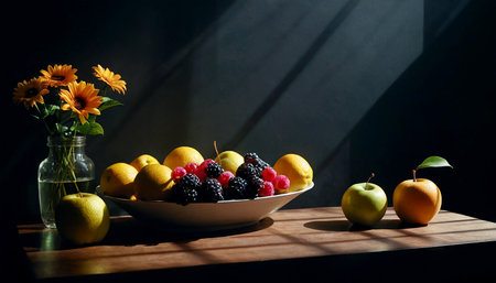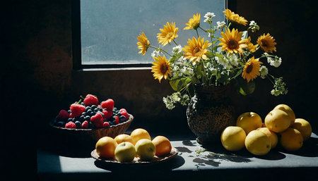 A simple provincial still life with fruits and flowers on a wooden table with natural light. AI generated.